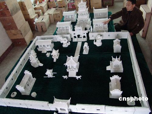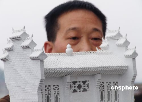 3月8日,江西省景德鎮(zhèn)羅冬根展示作品瓷器群雕《大觀園》。景德鎮(zhèn)陶藝家羅冬根用6年的時間,制作出面積達80平方米,主件有300多件的瓷器群雕作品《大觀園》。這部作品由建筑、園林、山水、民俗等部分組成,采用高白泥澀胎瓷制成,取題于《紅樓夢》大觀園,取材于蘇州園林和江南徽派建筑。中新社發(fā) 石衛(wèi)明 攝