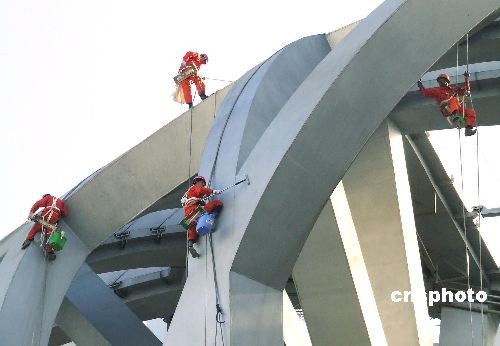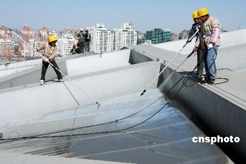 3月13日,中國(guó)國(guó)家體育場(chǎng)“鳥(niǎo)巢”開(kāi)始“洗臉美容”。據(jù)北京城建集團(tuán)國(guó)家體育場(chǎng)工程總承包部消息,此次清洗是為了迎接4月中旬的“好運(yùn)北京”測(cè)試賽。“鳥(niǎo)巢”膜結(jié)構(gòu)近92000平方米,在膜結(jié)構(gòu)清洗的同時(shí)還進(jìn)行鋼結(jié)構(gòu)保潔。圖為工作人員正在對(duì)“鳥(niǎo)巢”進(jìn)行鋼結(jié)構(gòu)保潔。中新社發(fā) 鄭雄增 攝