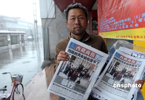 3月21日,一名拉薩市民頂著風(fēng)雪在拉薩街頭售賣(mài)揭露不法分子打砸搶燒罪行的報(bào)紙。拉薩市3月14日發(fā)生的打砸搶燒嚴(yán)重暴力犯罪事件,給當(dāng)?shù)厝嗣袢罕娚?cái)產(chǎn)造成重大損失,使當(dāng)?shù)厣鐣?huì)秩序受到嚴(yán)重危害。中新社發(fā) 廖攀 攝