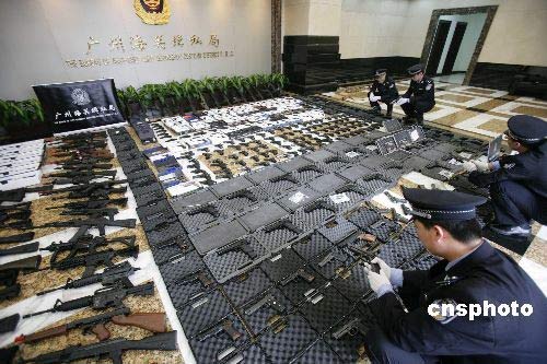 3月21日消息,廣州海關緝私局宣布,兩年前經過艱苦偵查,成功破獲了一個專門從事走私仿真槍的犯罪團伙,該起案件案值逾五百萬元人民幣,走私進口數量逾三千支。近日,廣州市中級人民法院對該案作出一審判決:以走私普通貨物罪分別判處譚某等十名被告有期徒刑六年到二年不等。圖為2006年破案后,海關關員清點走私仿真槍支。中新社發(fā) 陳國華 攝