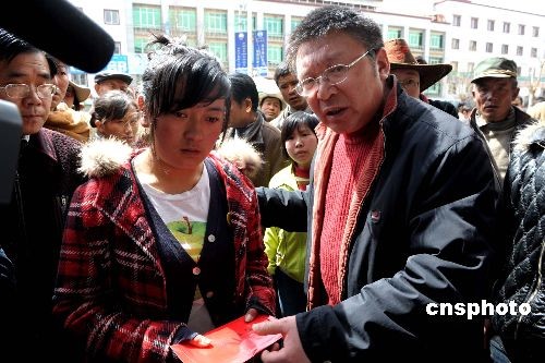 3月22日,拉薩一服裝店門(mén)前,中國(guó)新聞社西藏分社社長(zhǎng)柳俊武向受害者卓嘎捐助善款。在拉薩3月14日發(fā)生的打砸搶燒破壞活動(dòng)中,該服裝店的五名女員工被活活燒死在店中,卓嘎是當(dāng)時(shí)的幸存者。中新社發(fā) 廖攀 攝