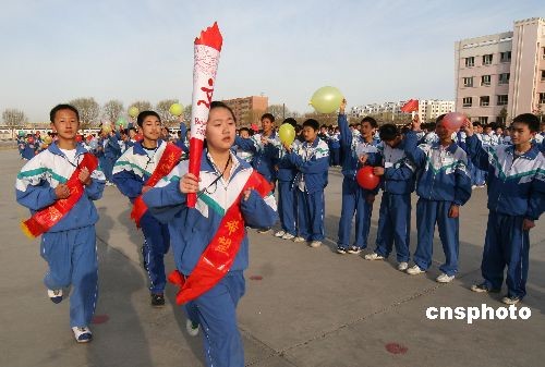 3月24日,為慶祝北京奧運圣火在希臘采集,新疆哈密市六中舉辦了“傳遞火炬 點燃激情”為主題的體驗奧運火炬?zhèn)鬟f活動,千余名學(xué)生參加了體驗傳遞奧運火炬活動。中新社發(fā) 普拉提 攝