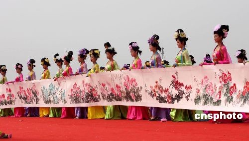 四月十日上午,河南省第二十六屆洛陽牡丹花會開幕慶典在該市新區(qū)體育中心廣場舉行。開幕式上,一百五十米長填色牡丹畫被英國吉尼斯總部和中國地區(qū)認證官員,當場認證為世界最長的填色牡丹畫。中新社發(fā) 王中舉 攝