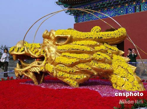 4月18日,金碧輝煌的中國龍造型在鮮花簇?fù)碇谐霈F(xiàn)在天壇公園西下坡花壇,表現(xiàn)出龍騰盛世的宏大場面。 這是天壇公園為迎接4月20日開始的北京國際馬拉松賽精心設(shè)計的。設(shè)計立意采用天壇祭天神樂禮器“麾”的造型,麾是韶樂演奏時用來傳達(dá)音樂起始的號令,其立意在于體現(xiàn)馬拉松測試賽吹響了即將到來的奧運號角。中新社發(fā) 九州 攝
