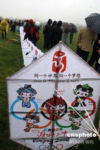 4月21日,第25屆濰坊國(guó)際風(fēng)箏會(huì)在山東濰坊浮煙山國(guó)際風(fēng)箏放飛場(chǎng)舉行萬(wàn)人放飛風(fēng)箏喜迎奧運(yùn)活動(dòng)。當(dāng)日下著雨,但是參加活動(dòng)的放飛者和觀眾依然熱情不減,盡顯世界風(fēng)箏之都——濰坊的魅力。圖為濰坊十三中學(xué)生手繪的由300多幅,208米長(zhǎng)的迎奧運(yùn)巨型風(fēng)箏格外引人注目。作者: 趙雋