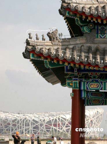 4月21日,北京奧林匹克中心區(qū)經(jīng)過一夜春雨的洗禮顯得清新而壯美。剛建好的雕梁畫棟的“九牌樓”、亭臺與國家體育場“鳥巢”遙相互應(yīng),現(xiàn)代與古典完美結(jié)合。作者: 吳芒子