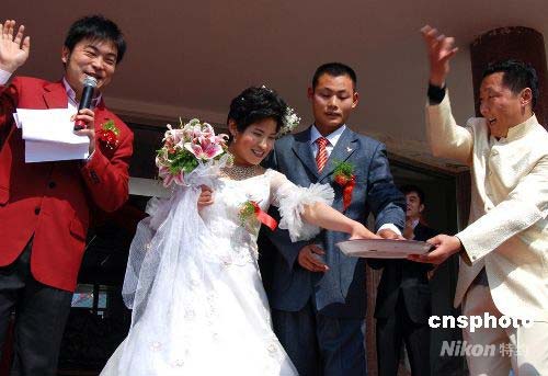 4月24日,頭戴玫瑰,身披婚紗,孤殘女孩趙殷娟在陣陣祝福和鞭炮聲中,羞答答走向迎新的婚車。這是江蘇省徐州市社會(huì)福利院,有史以來第一次為福利院收養(yǎng)的孤殘女舉辦出嫁儀式。中新社發(fā) 雍君 攝