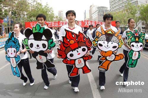 4月30日上午,新疆巴州舉行萬人火炬拉力長跑活動,迎接奧運倒計時100天。由部隊、兵團、油田、鐵路和地方組成的萬人火炬拉力長跑隊伍參加了全程11公里的火炬拉力長跑活動。中新社發(fā) 確·胡熱 攝