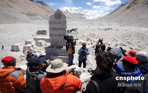 4月30日,北京奧運(yùn)會(huì)倒計(jì)時(shí)100天,受邀采訪2008北京奧運(yùn)會(huì)火炬接力珠峰展示活動(dòng)的中外媒體記者,集體在珠峰大本營探營。圖為他們?cè)谥榉宕蟊緺I珠穆朗瑪峰高程測(cè)量紀(jì)念碑前集體進(jìn)行采訪。中新社發(fā) 盛佳鵬 攝