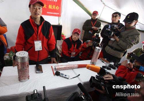 4月30日,受邀采訪2008北京奧運(yùn)會火炬接力珠峰展示活動的中外媒體記者,集體在珠峰大本營探營。中國航天科工集團(tuán)北京奧運(yùn)火炬研發(fā)部有關(guān)負(fù)責(zé)人,向中外媒體揭秘奧運(yùn)火炬接力珠峰展示活動所使用的珠峰火種燈、珠峰火炬、珠峰引火器。中新社發(fā) 盛佳鵬 攝