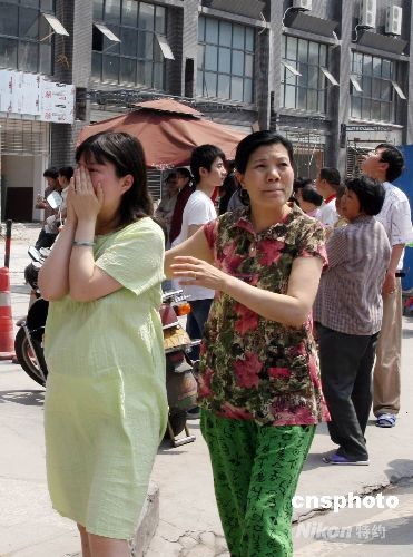 5月12日14時40分許,重慶各區(qū)縣出現(xiàn)強(qiáng)烈震感,重慶主城的通訊設(shè)施一度不通。據(jù)重慶市地震局局長陳鐵流稱,重慶出現(xiàn)震感是由四川汶川地震波及所致。圖為一名孕婦跑出高樓后驚魂未定。中新社發(fā) 郭晉嘉 攝