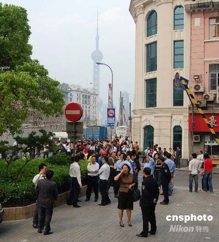 據(jù)上海市地震局剛剛提供的消息,中國地震臺測定,5月12日14時28分在四川汶川縣發(fā)生7.8級地震,上海高層建筑普遍有感,但不會對上海造成危害。圖為位于市中心35層的上海工商聯(lián)大廈樓前聚集的慌忙跑出的人群。中新社發(fā) 段更強 攝