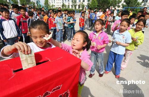 5月13日,新疆哈密新華私立學(xué)校開展向四川汶川地震災(zāi)區(qū)捐款活動,得到孩子們的積極響應(yīng),學(xué)生們踴躍為地震災(zāi)區(qū)捐款獻(xiàn)愛心。中新社發(fā) 普拉提 攝