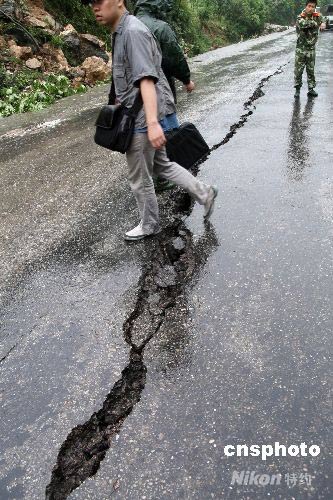 5月13日,通往四川地震重災(zāi)區(qū)綿陽市北川縣的公路上,出現(xiàn)一段段寬窄不等的嚴(yán)重裂縫。據(jù)稱,目前通往北川老縣城的唯一道路已被大石阻斷,只能步行攀爬通過。中新社發(fā) 郭晉嘉 攝