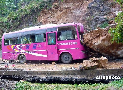 5月13日,通往四川省北川縣的公路已分層變形,一輛被巖石擊中的大巴車(chē)車(chē)頭嚴(yán)重變形。12日的地震在該路段引起多處山體滑坡,不少車(chē)輛被滾石擊中。中新社發(fā) 杜遠(yuǎn) 攝