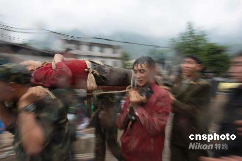 5月13日,中國(guó)空降兵6500多名官兵分別乘坐空軍遠(yuǎn)輸機(jī)奔赴四川重災(zāi)區(qū),分五路兵力,分別在什邡、德陽(yáng)、茂縣、等重災(zāi)區(qū)展開(kāi)救援。圖為解放軍士兵成功救出一名傷者。中新社發(fā) 譚超 攝