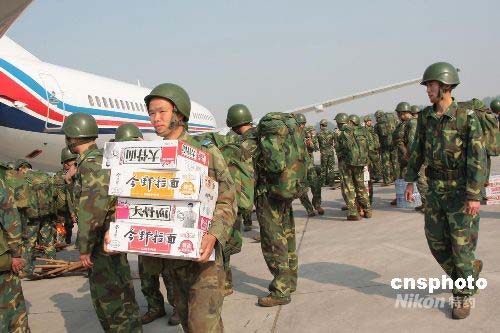 5月13日,空降兵6500多名官兵分別乘坐空軍遠輸機奔赴四川重災區(qū),分五路兵力,分別在什邡、德陽、茂縣、等重災區(qū)展開救援。圖為空降兵自帶干糧出發(fā)。中新社發(fā) 譚超 攝