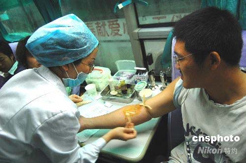 5月14日,重慶市西南大學(xué)育才學(xué)院近500名同學(xué)冒著大雨排隊獻血。重慶市合川區(qū)血液中心來到校園進行采集血液,引起了大量學(xué)生的踴躍報名獻血,場面一度失控。同學(xué)們血脈相通汶川,紛紛表示了對災(zāi)區(qū)人民的慰問之情。血液中心負(fù)責(zé)人介紹說,當(dāng)天采集了200余名學(xué)生的血液,將馬上運送到最需要的災(zāi)區(qū)。中新社發(fā) 許康平 攝