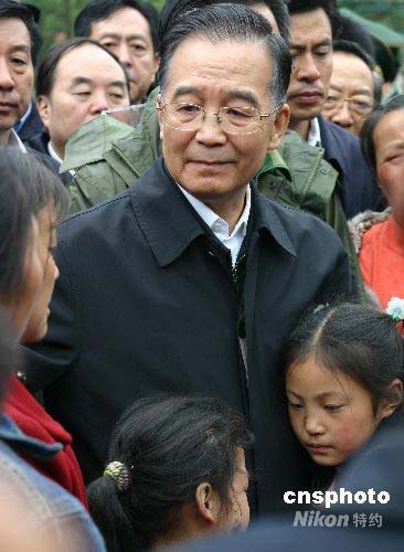 中國總理溫家寶十四日上午來到四川省北川縣看望受災群眾,在他向群眾講話時,雙手一直緊緊摟著兩個從北川中學塌陷的教學樓中逃生出來的孩子。中新社發(fā) 孫宇挺 攝
