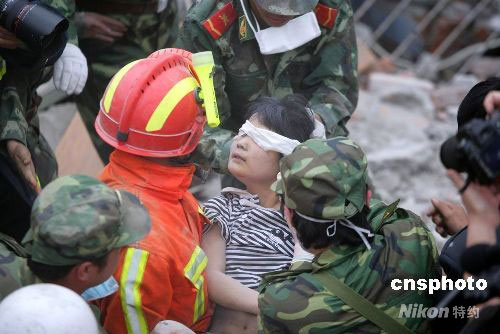 5月15日上午10時45分,映秀小學四年級學生張春梅在受困68小時后得救。中新社發(fā) 劉震 攝
