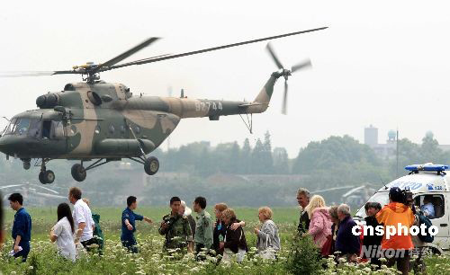 圖:外國(guó)游客在四川災(zāi)區(qū)被軍用直升機(jī)救出