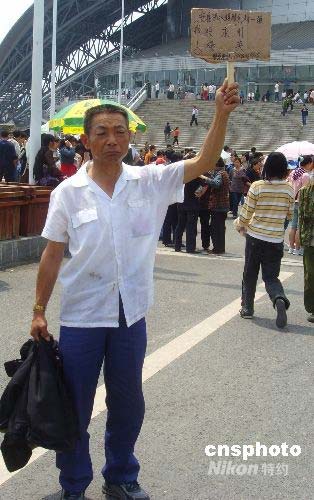 5月15日上午,來自受地震災害較為嚴重的四川綿陽安縣沸水鎮(zhèn)的一名男子來到綿陽市抗震救災最大的救助點——九州體育館外舉牌尋找親人。中新社發(fā) 霍潺 攝
