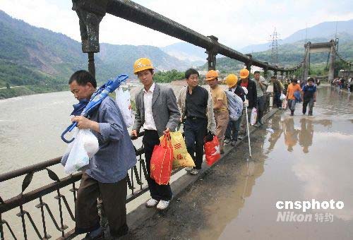 5月14日,四川岷江大峽谷紫平鋪水庫(kù)附近,來(lái)自汶川地震震中映秀、臥龍鎮(zhèn)大批災(zāi)后余生的災(zāi)民沿岷江峽谷脫離災(zāi)區(qū)。由于213國(guó)道數(shù)十處嚴(yán)重塌方,從都江堰到映秀、汶川的唯一道路被堵塞難以疏通,對(duì)災(zāi)區(qū)物資救援較為艱難。這些災(zāi)民依靠堅(jiān)韌的意志沿江邊和塌方帶用近八九個(gè)小時(shí)的艱苦步行脫離災(zāi)區(qū)進(jìn)入都江堰市區(qū),受到都江堰郊區(qū)農(nóng)民的歡迎和照顧,一些沿途居民特設(shè)免費(fèi)茶水給他們解渴。中新社發(fā) 周青先 攝