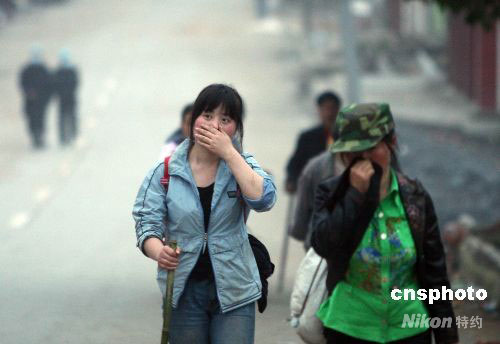 5月15日晚,幾名在距離紅白鎮(zhèn)鎮(zhèn)街幾十公里的西部神奇歡樂(lè)谷景區(qū)工作的人員步行逃出山區(qū)。12日發(fā)生的汶川大地震波及四川省德陽(yáng)市下轄的什邡市(縣級(jí)市)的多個(gè)鄉(xiāng)鎮(zhèn),紅白鎮(zhèn)與外界交通、通訊被完全阻斷。15日下午16時(shí)許,外界到紅白鎮(zhèn)鎮(zhèn)街的道路被打通。中新社發(fā) 郭晉嘉 攝