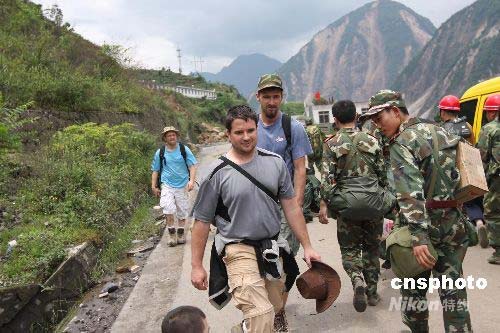圖:映秀鎮(zhèn)受困外國游客在前往安全地點(diǎn)