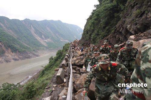 來(lái)自交通運(yùn)輸部的最新消息,從北、東、南三個(gè)方向通往汶川的道路目前仍在緊急搶修中。已全線搶通的西線道路因再次發(fā)生滑坡、泥石流災(zāi)害,受損十分嚴(yán)重,目前塌方路段能夠維持通行,但隱患較多。圖為5月14日逾千官兵徒步緊急趕往受災(zāi)嚴(yán)重的映秀鎮(zhèn)情景。中新社發(fā) 黃榮 攝