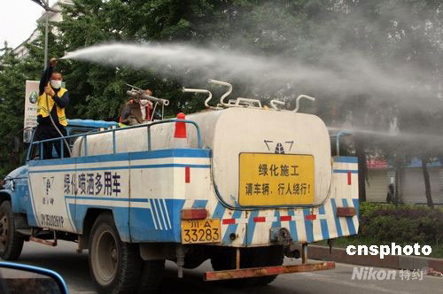 5月16日,四川都江堰市對市區(qū)及災(zāi)民安置點周邊環(huán)境進行消毒,加強防疫工作。中新社發(fā) 張雷 攝
