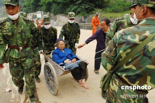 四川“5.12”大地震給北川羌族自治縣、汶川、都江堰等災(zāi)區(qū)帶來(lái)特大災(zāi)難,北川縣城遭到毀滅性重創(chuàng)。圖為北川災(zāi)民在救援官兵幫助下撤往安全地帶。中新社發(fā) 陳文 攝