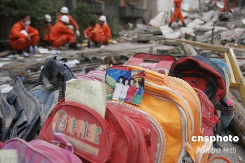 5月15日,在四川省什邡市紅白鎮(zhèn)中心小學(xué)廢墟旁,河南省消防總隊抗震救災(zāi)突擊隊的搜救人員將找到的孩子們的書包整齊排放,等待家長認領(lǐng),以告慰生者。其中一個書包上還放著一張孩子們的照片。 中新社發(fā) 張曉理 攝