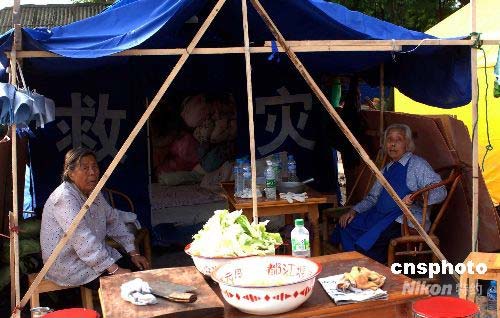5月中旬,四川都江堰市地震災(zāi)區(qū)的災(zāi)民陸續(xù)住上了各種各樣的防震棚。圖為抗震中不忘操持家務(wù)的兩位老人在地震棚中休息。中新社發(fā) 鄒憲 攝