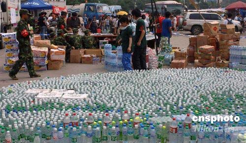 5月中旬, 來自四面八方的抗震救災(zāi)物資物品正在源源不斷地運往四川地震災(zāi)區(qū)。都江堰市一個災(zāi)民聚集點里,一度趨于緊張的飲用水供應(yīng)已經(jīng)出現(xiàn)好轉(zhuǎn),各種不同品牌的瓶裝水被排列成地震災(zāi)區(qū)的巨大圖形,時刻警醒著人們。中新社發(fā) 鄒憲 攝