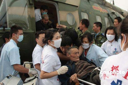 連日來(lái),中國(guó)空軍連續(xù)出動(dòng)軍用直升機(jī)到四川重災(zāi)區(qū)緊急搶運(yùn)危重傷員,及時(shí)送到成都進(jìn)行救治,為挽救幸存者生命贏(yíng)得時(shí)間。圖為5月15日,空軍航空兵某搜救團(tuán)轉(zhuǎn)移傷員的情景。中新社發(fā) 譚超 攝