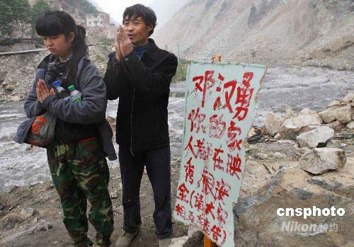 5月17日上午,在四川省汶川大地震中幸存的49歲映秀鎮(zhèn)頭道村農民鄧云祥和女兒鄧小琴,在通往家鄉(xiāng)的必經之地插上告示牌,企望失蹤的兒子鄧漢勇能夠平安歸來。鄧云祥的家鄉(xiāng)在映秀鎮(zhèn)通往臥龍大熊貓保護區(qū)的303國道8公里處,至今這條通往臥龍的道路幾乎全線被山體滑坡所覆蓋。中新社發(fā) 任晨鳴 攝
