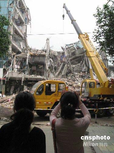 5月16日,抗震救災(zāi)人員在四川都江堰市一邊搜死者,一邊拆除建筑廢墟。5月12日中國(guó)汶川大地震,四川都江堰市內(nèi)絕大部分建筑出現(xiàn)致命性破壞,造成許多人員傷亡,大部分建筑失去使用價(jià)值。中新社發(fā) 鄒憲 攝