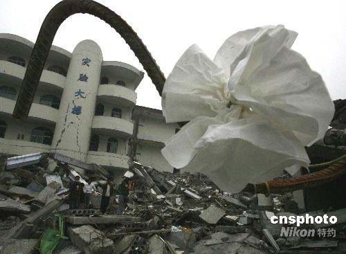 五月十七日,在汶川大地震中垮塌的灌縣聚源中學廢墟上,生存的同學把白花系在扭曲的教學樓鋼筋上,沉痛悼念失去生命的五十多位師生。中新社發(fā) 賈國榮 攝