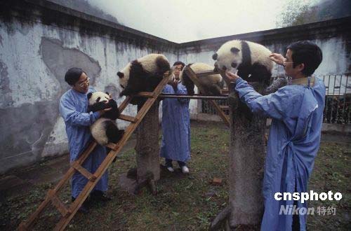 四川省汶川縣發(fā)生里氏7.8級強烈地震后,位于震中的臥龍大熊貓保護區(qū)通訊和交通全部中斷,與外界失去聯(lián)系。16日,兩名保護區(qū)工作人員攜帶衛(wèi)星電話坐直升飛機降落到臥龍以后,得到最新消息:繁育基地的大熊貓圈舍損毀嚴重,14座完全損毀,18座嚴重損毀,但因為有圍墻,絕大部分大熊貓目前安全。幼仔已被轉(zhuǎn)移到平緩的安全地帶,但暫住條件相對擁擠。圖為地震之前,臥龍研究人員在精心照顧大熊貓幼仔。中新社發(fā) 羅小韻 攝
