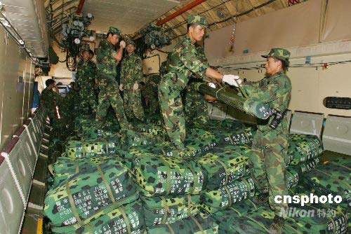 5月17日下午,運載著2500頂帳篷的兩架伊爾-76型運輸機從福州起飛,將總重150噸的救災物資送往四川地震災區(qū)。這是汶川地震發(fā)生后,駐閩部隊送出的首批救災物資。據了解,該批帳篷為81式班用帳篷,支起后面積可達30平方米,能同時容納12人,這批帳篷可解決3萬人臨時住宿問題。中新社發(fā) 小小 攝