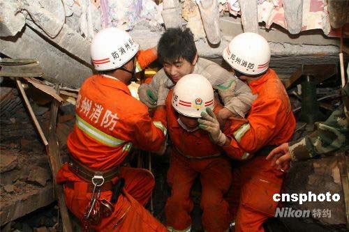 16日晚10時38分,在地震重災(zāi)區(qū)四川什邡市鎣華鎮(zhèn),鄭州消防支隊所在的河南總隊抗震救災(zāi)突擊隊,經(jīng)過8個多小時的連續(xù)奮戰(zhàn),一名被困廢墟中的二十歲男子被成功救出,而此時,他在廢墟中已被困了104小時,他的名字叫李青松。中新社發(fā) 申治民 攝