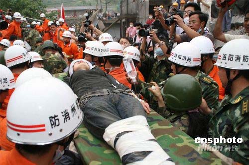 5月17日晚18時(shí)30分,在地震重災(zāi)區(qū)四川什邡市鎣華鎮(zhèn),鄭州消防支隊(duì)所在的河南總隊(duì)抗震救災(zāi)突擊隊(duì)第一梯隊(duì)成功營救一名被廢墟埋壓124小時(shí)的婦女。中新社發(fā) 申治民 攝