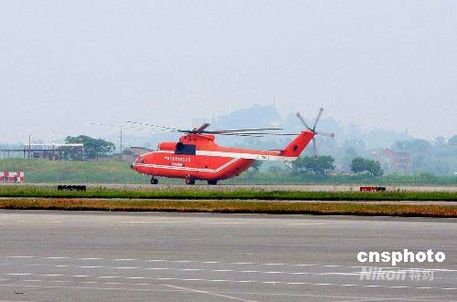 5月17日中午,一架航班號為FD7802的M26多用途重型直升機經(jīng)停重慶機場一小時后,飛赴四川災區(qū)執(zhí)行救援任務(wù)。據(jù)介紹,M26多用途重型直升機是目前世界上最大的直升機,其機身長約40米、機高11.6米、旋翼長32米,空機約重28噸,最大起飛權(quán)重達到56噸,最多可容納100余人,是實施救援的主戰(zhàn)直升機。自四川汶川地震發(fā)生后,毗鄰四川的重慶機場共保障抗震救災飛行共85架次。中新社發(fā) 肖漢飛 攝