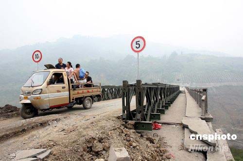 圖:官兵在災(zāi)區(qū)壽江大橋上搭建橋上橋