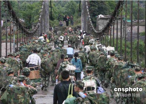 有“鐵軍”稱號的濟(jì)南軍區(qū)某集團(tuán)軍官兵沿岷江向汶川進(jìn)軍。中新社發(fā) 曾憲平 攝