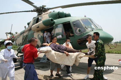 5月18日中午1時(shí)許,首批來自四川北川縣重災(zāi)區(qū)的20名受重傷群眾,被總參某陸航團(tuán)4架直升機(jī)運(yùn)到空軍駐彭山機(jī)場,立即被送到眉山市各主要醫(yī)療單位救治。從當(dāng)天起,一大批來自北川邊遠(yuǎn)鄉(xiāng)鎮(zhèn)的重傷員將通過這條“空中生命線”接到眉山救治。中新社發(fā) 堯遙 攝