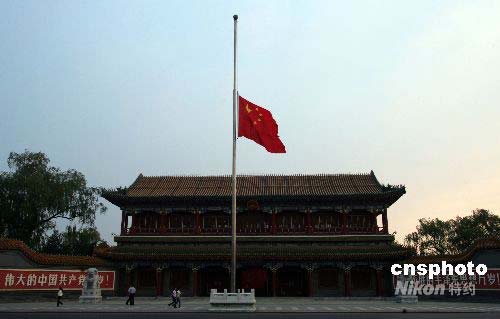 5月19日清晨,北京新華門下半旗,哀悼5·12汶川大地震中遇難同胞。中國(guó)國(guó)務(wù)院作出決定,5月19日至21日為全國(guó)哀悼日。在此期間,全國(guó)和各駐外機(jī)構(gòu)下半旗志哀,停止公共娛樂(lè)活動(dòng),中國(guó)外交部和中國(guó)駐外使領(lǐng)館設(shè)立吊唁簿。5月19日14時(shí)28分起,全國(guó)人民默哀3分鐘,屆時(shí)汽車、火車、艦船鳴笛,防空警報(bào)鳴響。中新社發(fā) 張宇 攝