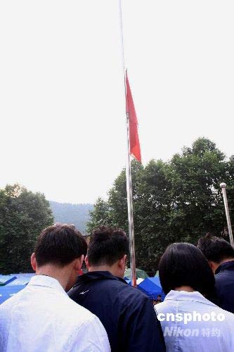 五月十九日清晨,四川省重災區(qū)青川縣人民在青川中學舉行降半旗儀式,向“五·一二”四川汶川大地震死難同胞致哀。中新社發(fā) 黃榮 攝
