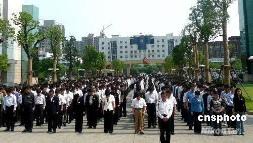 5月19日, 揚(yáng)州市委、市人大、市政府、市政協(xié),各區(qū)委、區(qū)政府及市直有關(guān)部門下半旗,沉痛哀悼四川地震遇難同胞。14時(shí)28分起,全市人民默哀3分鐘,汽車、火車、船舶鳴笛,各防空警報(bào)點(diǎn)防空警報(bào)鳴響。在全國(guó)哀悼日期間,停止公共娛樂活動(dòng),開展一系列的哀悼活動(dòng),以表哀思。截至18日晚,揚(yáng)州市募集賑災(zāi)捐款突破千萬(wàn)元人民幣。圖為揚(yáng)州市政府大院全體工作人員胸佩白花集體列隊(duì)默哀。中新社發(fā) 崔佳明 攝
